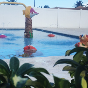 Piscina para adulto y piscina aparte con chorritos para niños.